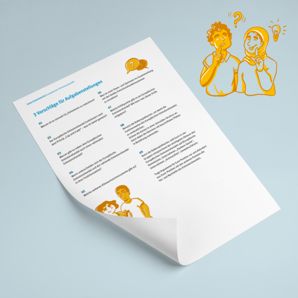 Um das Thema für Schüler*innen möglichst verständlich zu machen, wurde eine umfangreiche Handreichung für den Unterricht entwickelt. Das Material beinhaltet Spiele, FactSheets, Handouts und Präsentationsvorlagen, die von den Lehrer*innen eingesetzt werden können und hier zum Download bereitstehen: https://www.umweltbundesamt.de/publikationen/der-europaeische-emissionshandel.